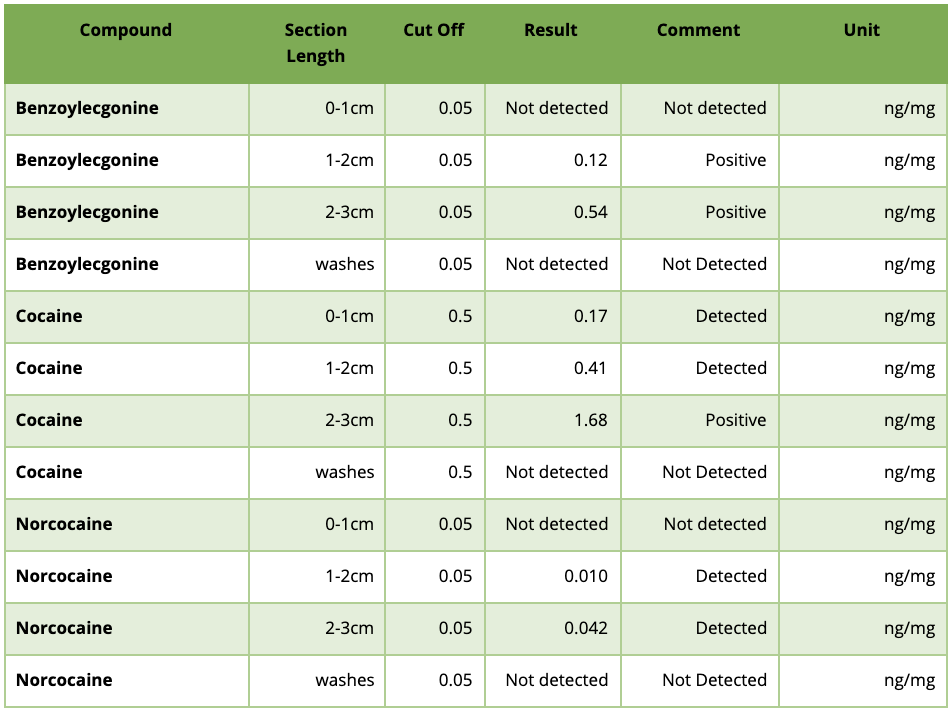 Cocaine was detected in the second segment below the SoHT recommended cut off level. Cocaine metabolites benzoylecgonine and norcocaine were also detected in the second segment. These results suggest either the low consumption of cocaine during the second month or from the previous use of cocaine prior to the second month.