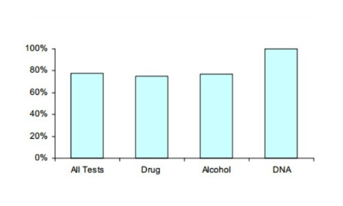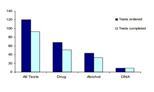 This analysis shows that 75% of drugs test, 77% of alcohol tests and all DNA tests were completed and returned to court. This may show the importance of the DNA testing procedure, as questions were raised about parentage, the outcome was deemed essential in determining a correct outcome
